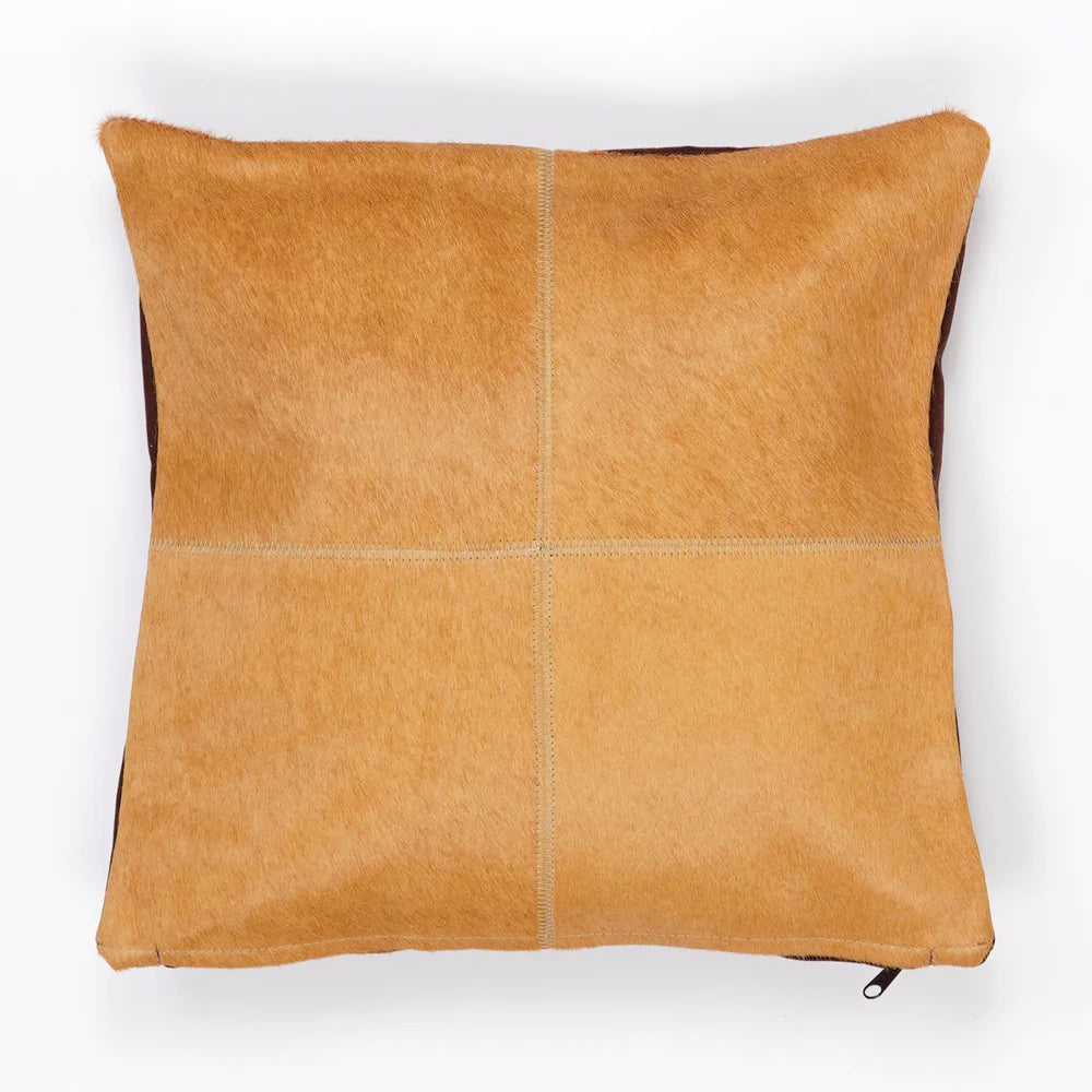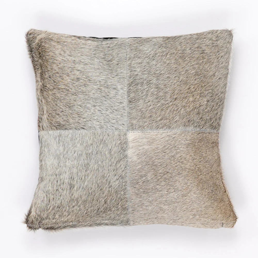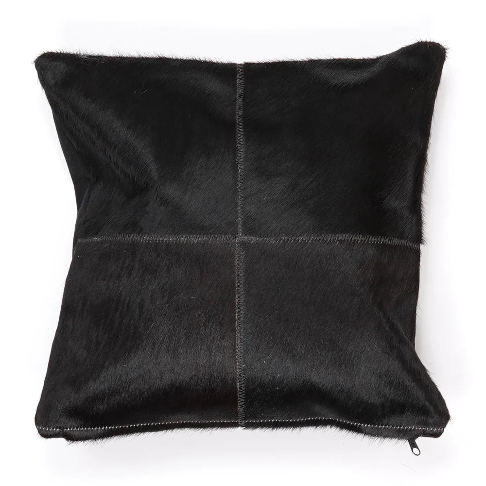Each cushion is handmade and consists of carefully selected square patches of genuine cowhide, which are sewn together by hand to create a modern, striking patchwork design.